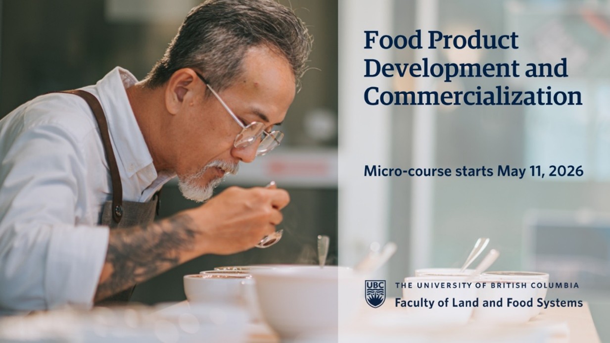 Registration for Food Product Development and Commercialization opens April 13, 2026: https://www.landfood.ubc.ca/certificate/food-product-dev/